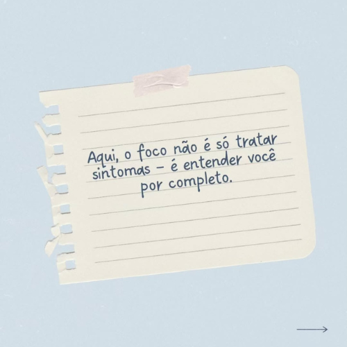 Meu objetivo é oferecer um acompanhamento que enxergue você por inteiro, combinando escuta qualificada, avaliação detalhada e estratégias de cuidado personalizadas para o seu dia a dia.